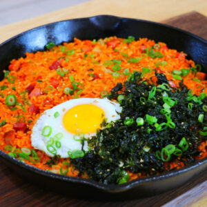 - To serve, top the kimchi fried rice with the fried egg and garnish with sesame seeds and roasted seaweed flakes.