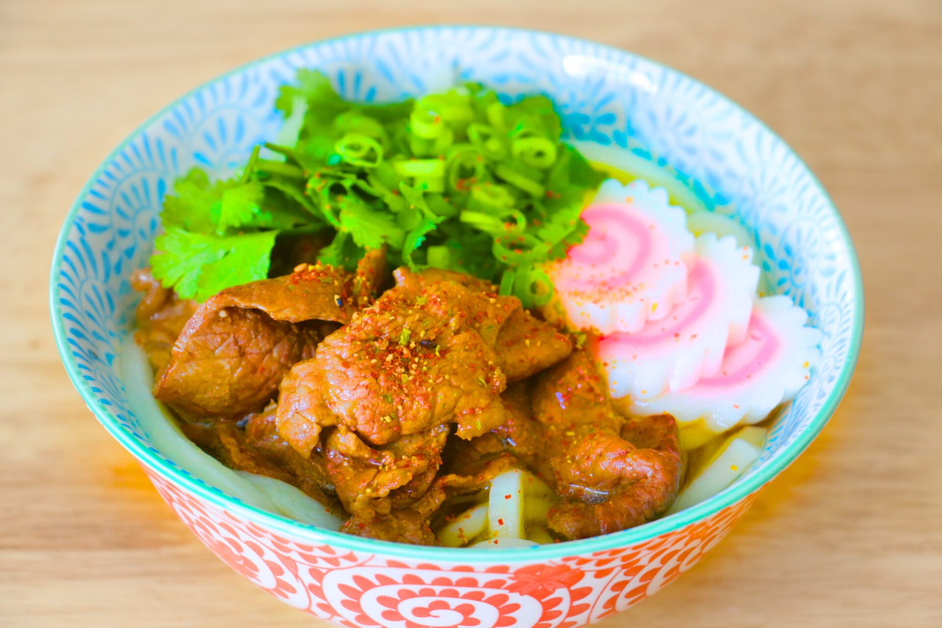 - Top with cooked beef, fish cake slices, chopped scallion greens, and cilantro.