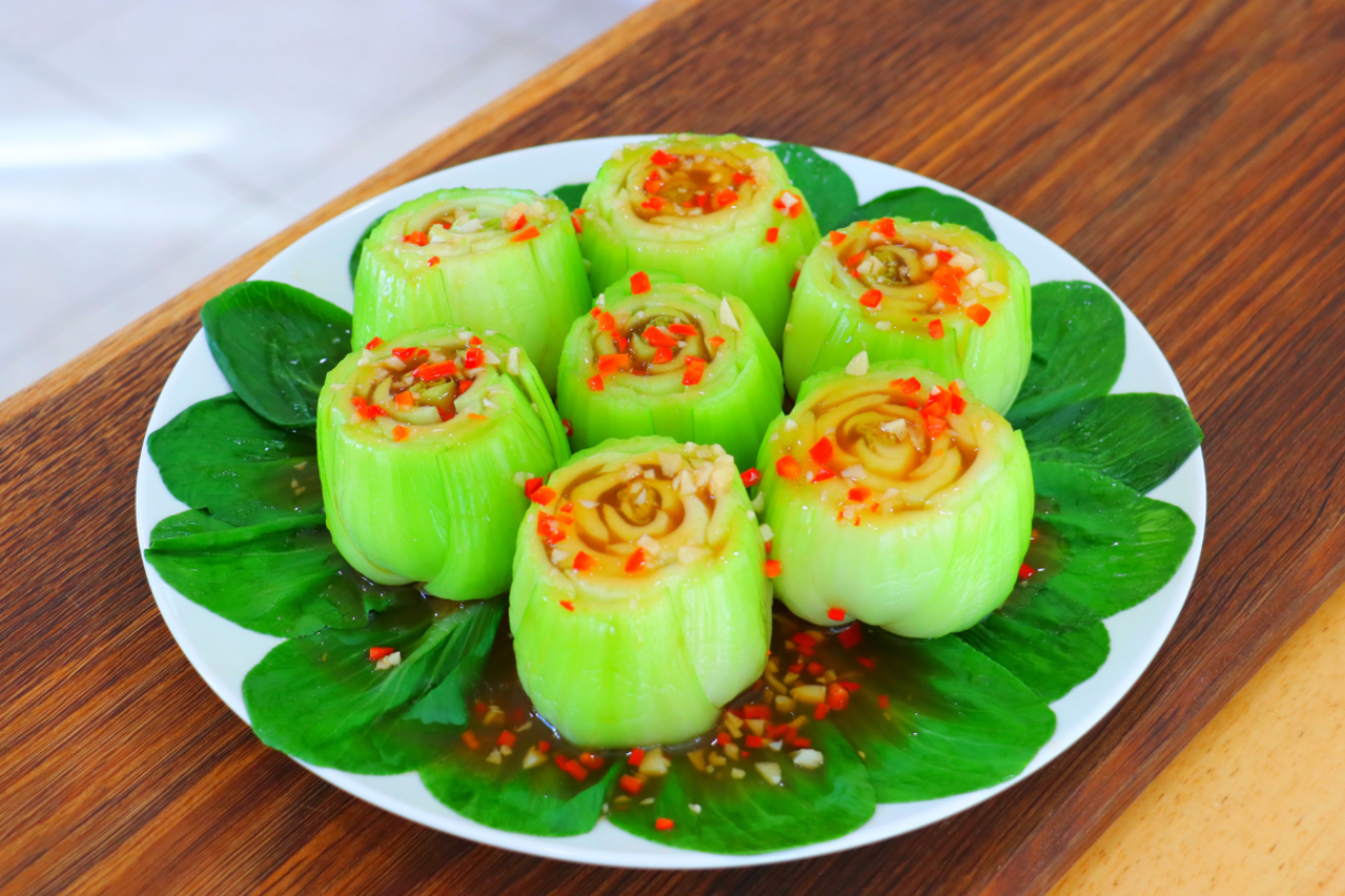 Bok Choy with Chili Garlic Sauce is a quick and visually stunning vegetable side that comes together in under 10 minutes. When the base of each bok choy is sliced off, the stems bloom into green “flowers.” Blanched until just tender and topped with a flavorful garlic chili sauce, this simple dish is vibrant, healthy, and deeply satisfying.