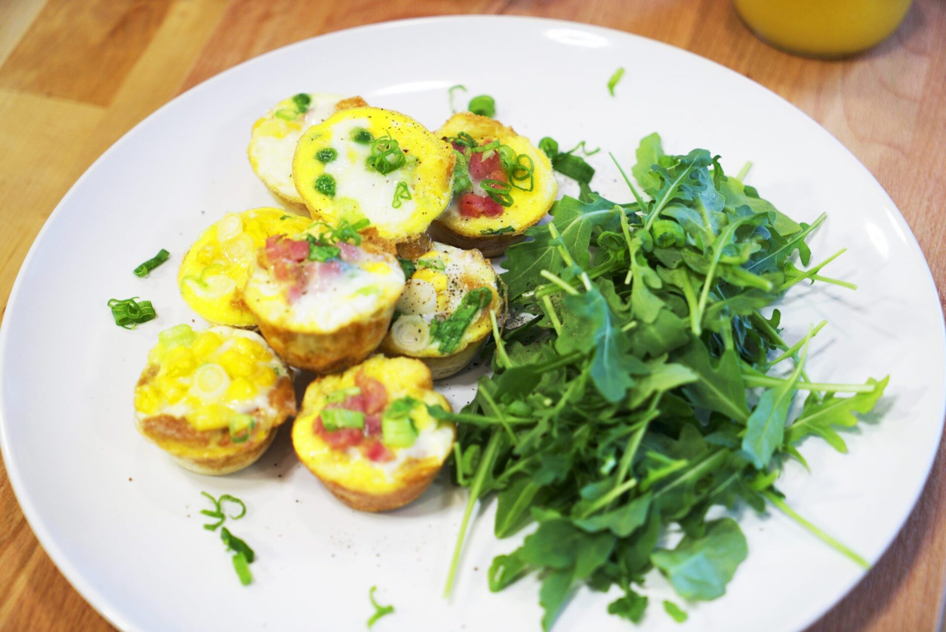 Into each muffin cup add a small spoonful of scallions, ham, peas, and corn. Of course, you can mix and match, and have fun with it.