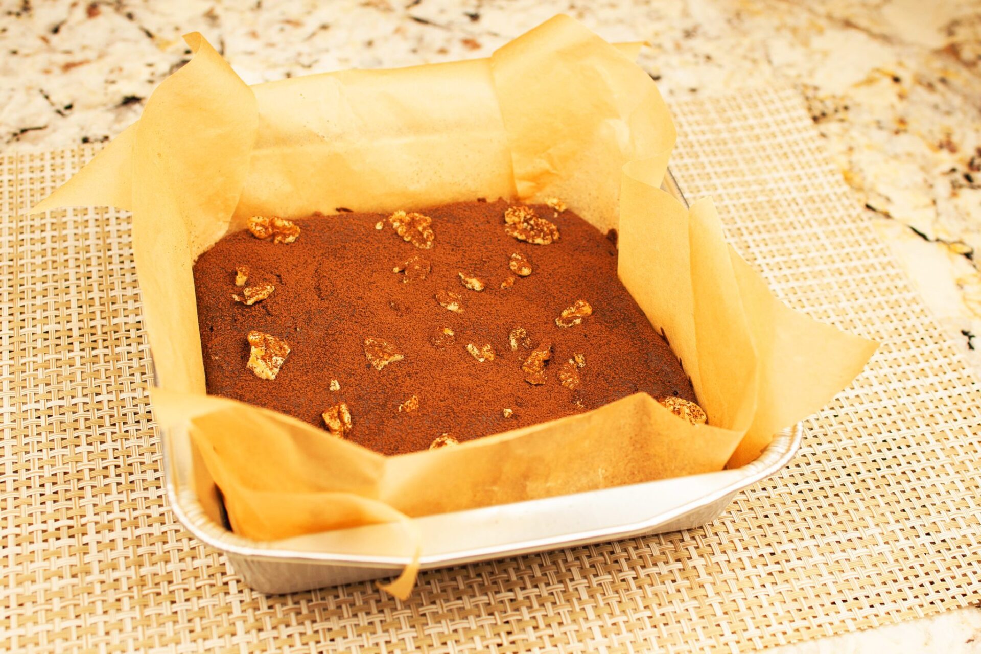 Pour the batter into a 8″ by 8″ by 3″cake pan. Sprinkle with chopped walnuts. Bake it in the oven at 330° F for 35 minutes. Let cool before cutting and serving.