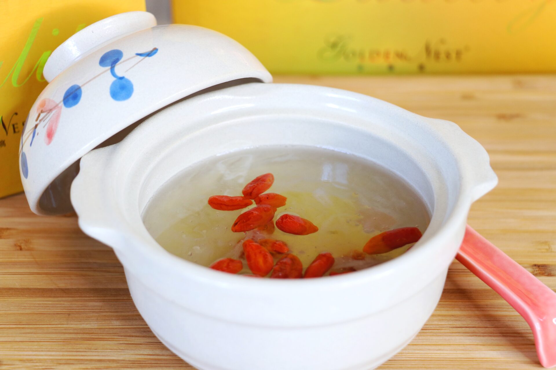 Uncover the lids, add in the rock sugar and stir until dissolved. Lastly, add in the goji berries. (If you cook goji berries for too long, you will also destroy the nutrition it it.)