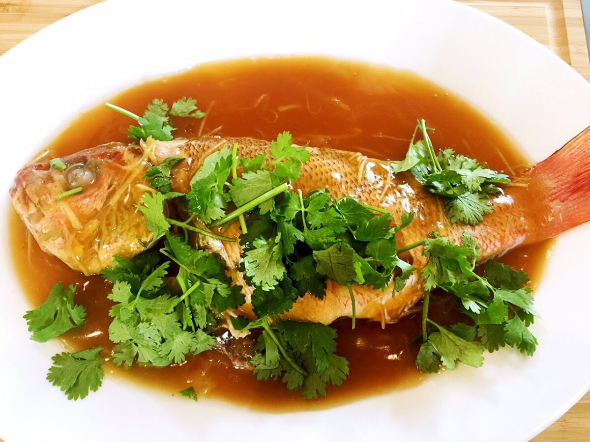 Boil water in a pot. Throw in 3 stalks of scallions and 3 slices of ginger. Put the whole fish in the pot, put on the lid, and allow the water to boil for about 4 minutes, then turn off the heat, and let it poach for about 6 minutes. (This technique is going to make the fish more delicate and tenderer than boiling and steaming it alone.)